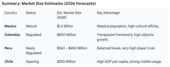 - Market Size: Conservative estimates place Chile’s addressable market at over US$350–$500 million in GGR for 2026.